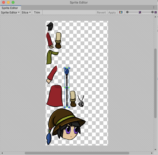 The same file with its individual layers imported as separate Sprites merged into a single Texture in a mosaic formation.
