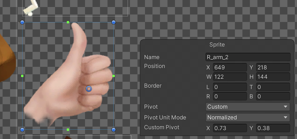 The Sprite Resolver's Label is set to `blue scarf`. If you want to switch more than one Sprite at a time, consider [swapping the Sprite Library Asset](SLASwap.md) to switch to an entire alternate set of Sprites. ## Sprites pivot alignment When working with [skinned Sprites](SkinningEditor.md), the positions of their Meshes' vertices are calculated based on the current skeleton pose, and are unaffected by each Sprite’s individual pivot. However, when [swapping](SpriteSwapIntro.md) Sprites which are not skinned (that is not [Rigged](SkinEdToolsShortcuts.md#bone-tools) to an actor’s skeleton), then they may not align correctly as their pivots are not in the same relative positions. This is especially noticeable if the Sprites are of very different sizes. The following example shows how Sprites can misalign when a skinned Sprite is swapped with an unskinned one: | ![Figure 1: The original `open hand` Sprite.](images/Pivot_Scene_OpenHand.png) | ![Figure 2: Swapping to the `thumbs up` Sprite. ](images/Pivot_Scene_GestureOffset.png) | | ----------------------- | ----------------------- | | Figure 1: The original `open hand` Sprite. | Figure 2: Swapping to the `thumbs up` Sprite. | In this example, the GameObject containing the Sprite and the Sprite Swap component are aligned to match the `open hand` Sprite in the Skinning Editor. As the `thumbs up` Sprite is not rigged to the same skeleton, it appears misaligned as its pivot location is not in the same relative position as the original Sprite. To align the unskinned `thumbs up` Sprite, it is necessary to adjust it’s pivot to match the relative position of the `open hand` Sprite’s pivot. __Note__: If a Sprite is rigged to a skeleton, then its individual pivot location is overridden by the influence and position of the bone it is weighted to . To change the pivot position of a Sprite, first select the Sprite in the Sprite Editor, which causes the __Sprite__ panel to appear at the bottom right of the __Sprite Editor__ window. The __Sprite__ panel shows details of the selected Sprite, such as its __Name__, __Position__, and __Pivot__ properties. You can select from a dropdown list of predefined pivot options from the __Pivot__ menu. These include options such as __Center__ and __Top Left__, as well as __Custom Pivot__ (this unlocks the __Custom Pivot__ position property settings, allowing you to input your own custom position for the pivot). In this example, the two swapped Sprites are aligned by changing the __Pivot__ property from __Center__ to __Custom Position__, and inputting the Custom Pivot position that aligns the `thumbs up` Sprite with the ``open hand`` Sprite. ![](images/Pivot_SpriteEditor_Gesture.png) ![](images/Pivot_SpriteEditor_Fixed.png) After applying the changes, the swapped Sprite is now aligned with the rest of the actor after the Sprite Swap. ![Pivot Fixed](images/Pivot_Scene_Fixed.png)