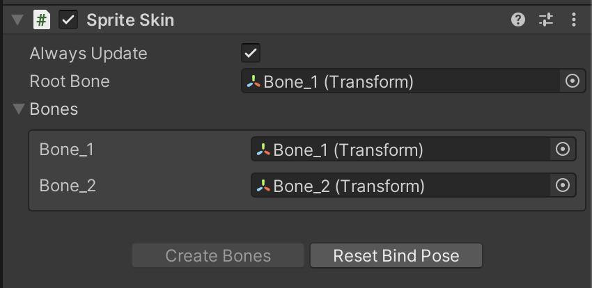 When the character Prefab is brought into the Scene view, Unity automatically adds the __Sprite Skin__ component to any Sprite that has any [bone influences](SkinEdToolsShortcuts.md#bone-influences). This component is required for the bones to deform the Sprite meshes in the Scene view.