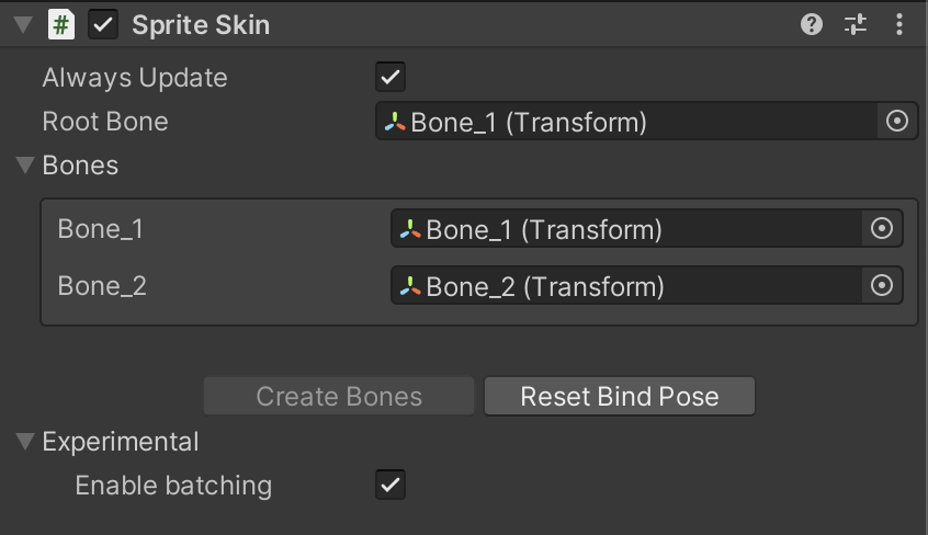 With both packages installed, __Enable batching__ becomes available in the [Sprite Skin component](SpriteSkin.md) properties. Note that if you do not have the required packages installed, the option will not be visible.