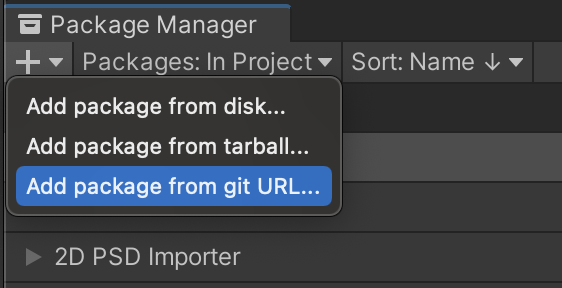 2. Press **+** at the upper-left corner of the **Package Manager** window to open a drop-down menu, then select **Add package from git URL…** from the list of options.