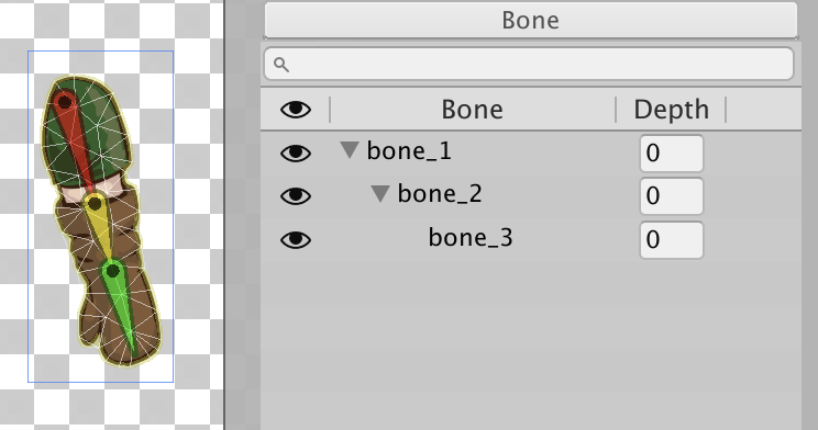 In the above example, the Sprite is rigged with three connected bones - starting with 'bone_1' as the root bone, 'bone_2' as a child of 'bone_1', and 'bone_3' as a child of 'bone_2'.