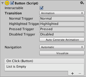 To use the Animation transition mode, an Animator Component needs to be attached to the controller element. This can be done automatically by clicking "Auto Generate Animation". This also generates an Animator Controller with states already set up, which will need to be saved.