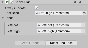 The order of the bones in the Bone Influences panel determines the order of the bones on the __Sprite Skin __component. This is especially important when replacing the Sprite for deformation in the Sprite Renderer, such as when using Sprite Swap, as you can ensure the bone order remains the same between the Sprites and that the correct Transform drives the correct deformation.