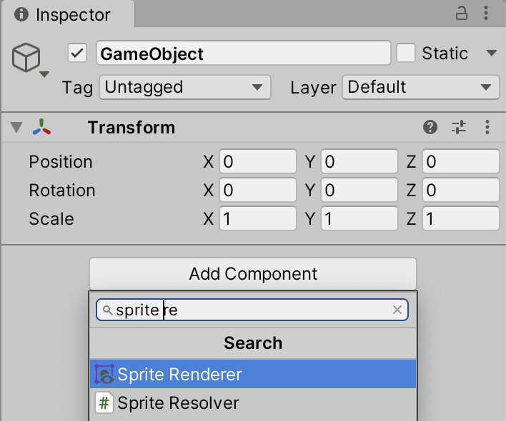 5. Next, create an empty GameObject (menu: Right-click on the Hierarchy window > Create Empty). Select it and then add the Sprite Renderer component.