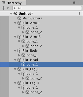 5. Create another GameObject at the root of all the GameObjects, and call it 'Rikr_Root'. Reparent the 'Rikr_Body' GameObject to the 'Rikr_Root' as its child.