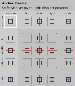 The Anchor Presets buttons displays the currently selected preset option if there is one. If the anchors on either the horizontal or vertical axis are set to different positions than any of the presets, the custom options is shown.
