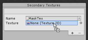 The 2D Lights package suggests the names ‘MaskTex’ and ‘NormalMap’. Select the name that matches the function of the selected Texture - select ‘MaskTex’ for a masking Texture, or ‘NormalMap’ for a normal map Texture. Naming these Textures correctly allow them to interact with the 2D Lights Shaders to properly produce the various lighting effects.
