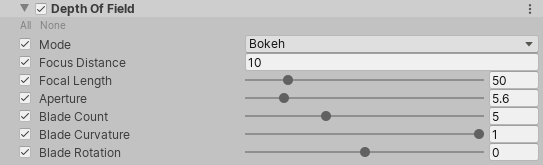 | Mode | Use this drop-down to select the mode that URP uses to set the focus for the depth of field effect. • Off: Select this option to disable depth of field. • Gaussian: Select this option to use the faster but more limited depth of field mode. • Bokeh: Select this option to use the Bokeh-based depth of field mode. |