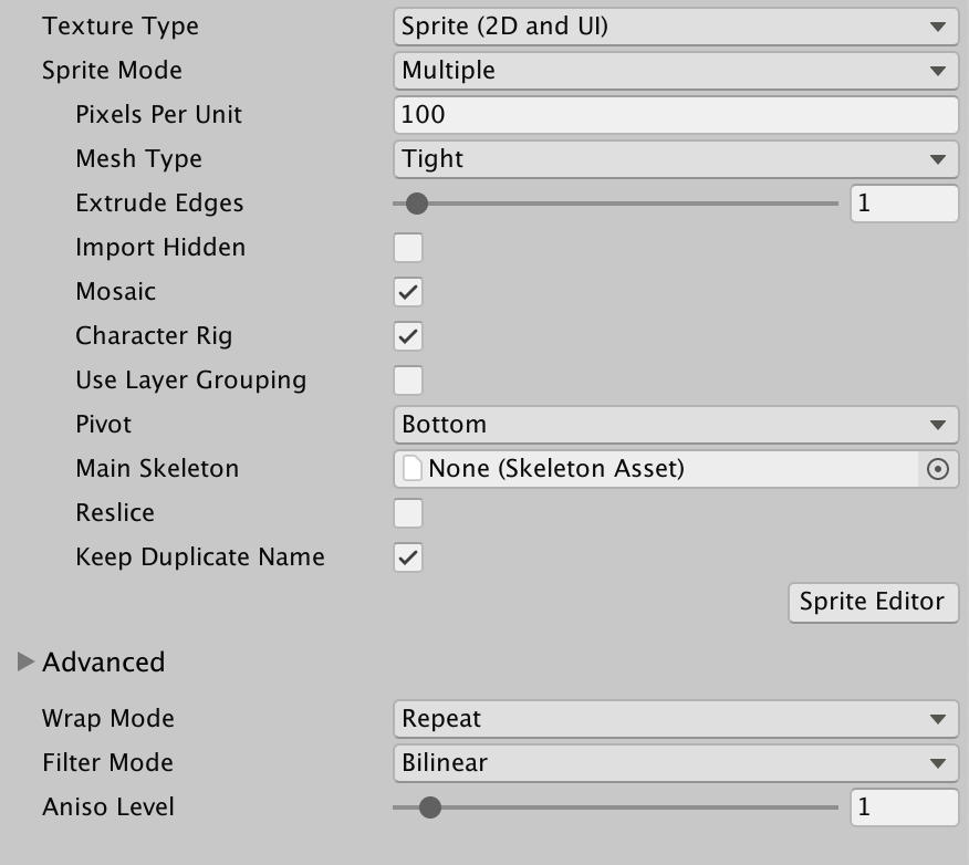 Reslice This is available only when Mosaic is enabled. Enable this setting to regenerate the Sprite from the imported layers and clear any changes you have made to the Sprite and its metadata.