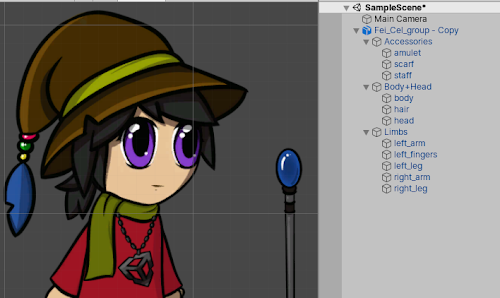 Refer to the following examples of a character designed in Photoshop and how its original layer hierarchy is transposed to the Prefab generated by the PSD Importer.