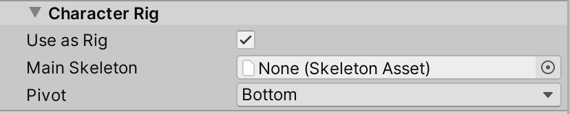 | Main Skeleton | This is only available when Use as Rig is enabled. Assign the Skeleton Asset that this character Prefab’s bone hierarchy will reference. If no Skeleton Asset is assigned, the importer will automatically generate a Skeleton Asset as a sub-asset of this character. The Skeleton Asset contains the bone hierarchy of the Asset that was defined in the 2D Animation package's Skinning Editor (refer to Skeleton Sharing for more information). |