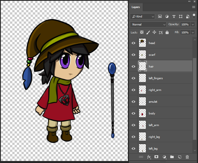 The following is a general workflow for importing a multilayered and multipart character into Unity for 2D animation with the PSD Importer, with a more detailed specific example available in the Character imported with the PSD Importer sample documentation: