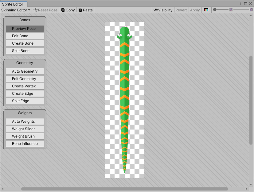 The Skinning Editor is a module which is added to the Sprite Editor after installing the 2D Animation package. Use the editor's tools to create the bones of your actor's skeleton, generate and edit its mesh geometry, and adjust the weights that bind the bones to the meshes as you rig your actor.