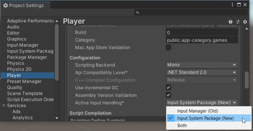 Click on the Player item in the list and go to Active Input Handling. Set the input system to Input System Package (New) or Both.