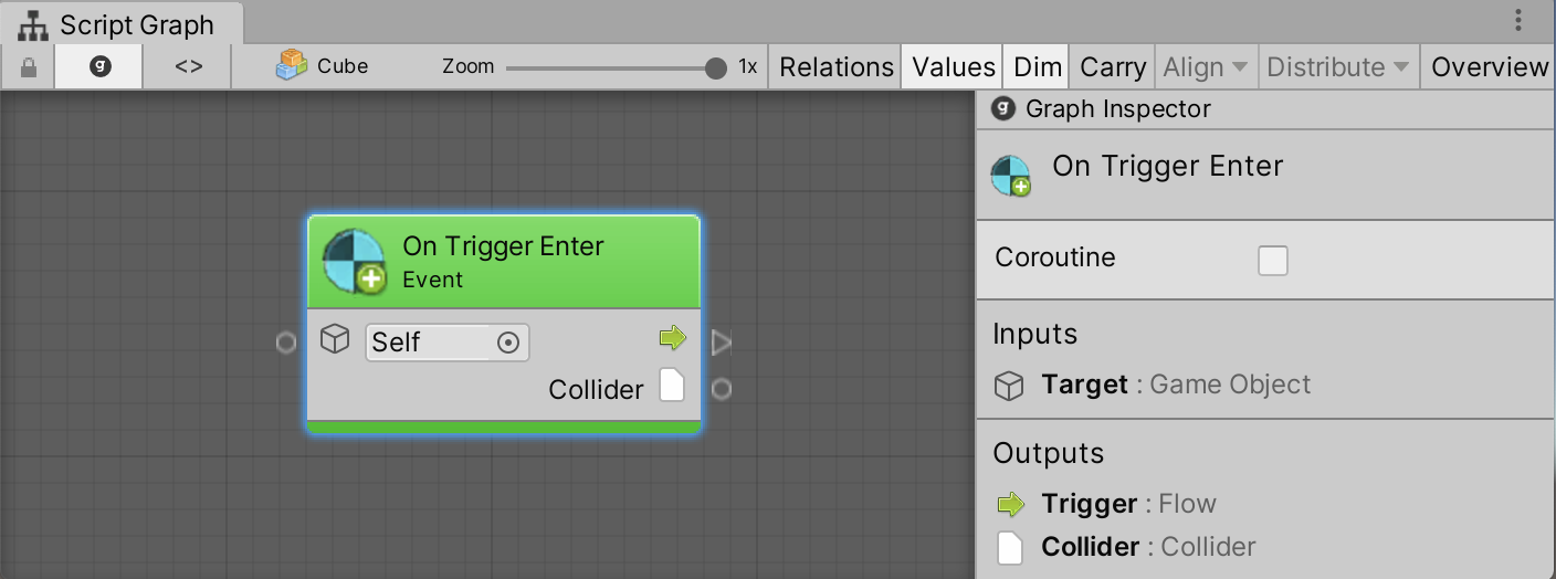 The value outputs on events are arguments that are passed from the event, giving you more information about what actually happened. For example, on the On Trigger Enter event, the other collider that is involved in the collision is an output.