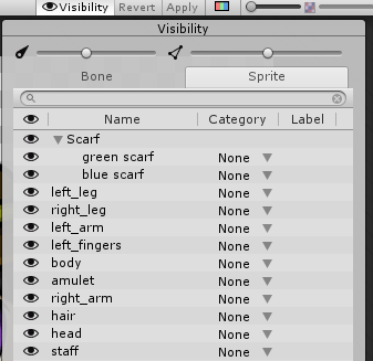 Sprite meshes within the editor window. Move either slider further to the left to decrease the visibility of the bones or meshes respectively, and to the right to increase their visibility.