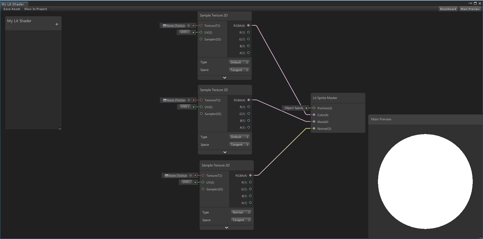 In the Blackboard on the left side, add three new Texture2D items which can be named anything. However, it is required to name the reference for MainTex as _MainTex to render Sprites. It is also recommended to name the references for Mask as _MaskTex and Normal as _NormalMap to match the Shader inputs used in this package.