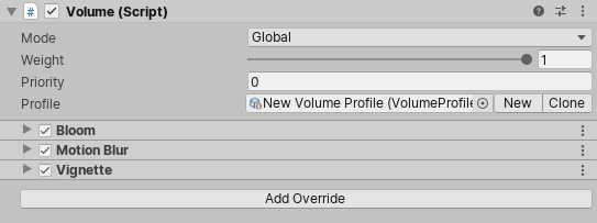 For example, click on the Add Override button and select the Motion Blur Volume override. This exposes properties relating to the Motion Blur effect in URP.