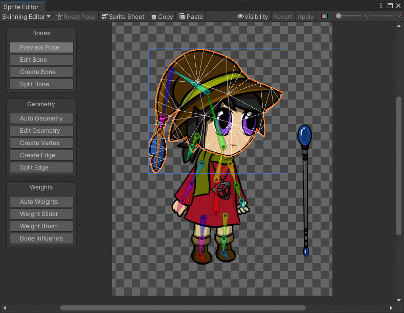 The Skinning Editor is a module which is added to the Sprite Editor after installing the 2D Animation package. Use the editor's tools to create the bones of your actor's skeleton, generate and edit its mesh geometry, and adjust the weights that bind the bones to the meshes as you rig your actor.