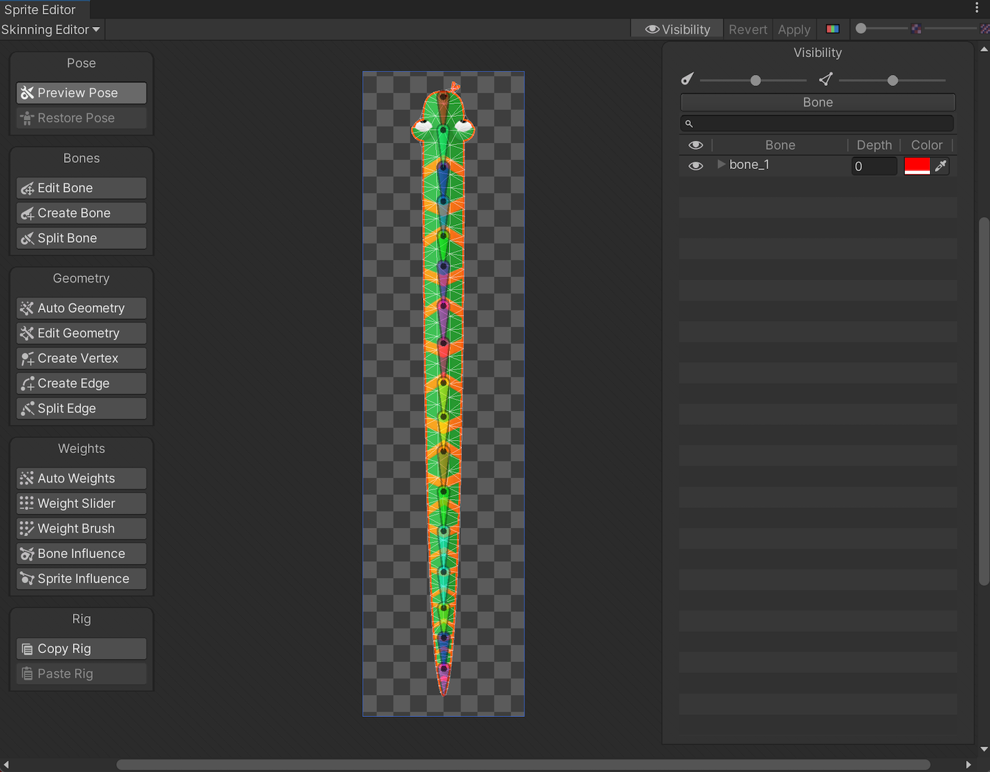 Open the Asset Assets/Samples/2D Animation/[X.Y.Z]/Samples/1 Simple/Sprites/Boris.png in the Skinning Editor module to examine how the Sprite is rigged.