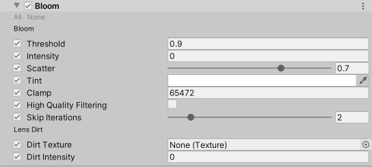 | Threshold | Set the gamma space brightness value at which URP applies Bloom. URP does not apply Bloom to any pixels in the Scene that have a brightness lower than this value. The minimum value is 0, where nothing is filtered. The default value is 0.9. There is no maximum value. |