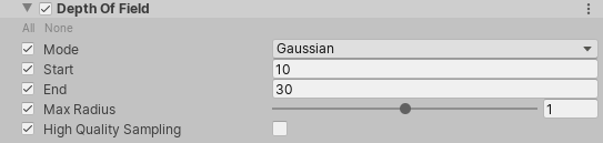 | Mode | Use this drop-down to select the mode that URP uses to set the focus for the depth of field effect. • Off: Select this option to disable depth of field. • Gaussian: Select this option to use the faster but more limited depth of field mode. • Bokeh: Select this option to use the Bokeh-based depth of field mode. |