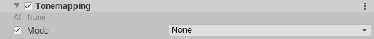 | Mode | Select a tonemapping algorithm to use for color grading. The options are: • None: Use this option if you do not want to apply tonemapping. • Neutral: Use this option if you only want range-remapping with minimal impact on color hue & saturation. It is generally a good starting point for extensive color grading. • ACES: Use this option to apply a close approximation of the reference ACES tonemapper, for a more cinematic look. It is more contrasted than Neutral, and has an effect on actual color hue & saturation. If you use this tonemapper, Unity does all the grading operations in the ACES color spaces, for optimal precision and results. |