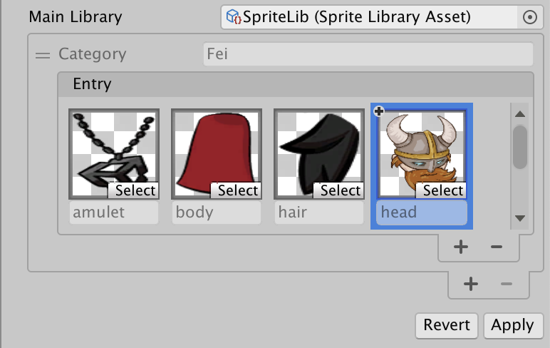 You can also edit an Entry to change the Sprite that it refers to by selecting Select and choosing a different Sprite in the Object Picker window. To revert changes to a Sprite, select the inner - to restore it to the original Sprite that was retrieved from the Main Library.